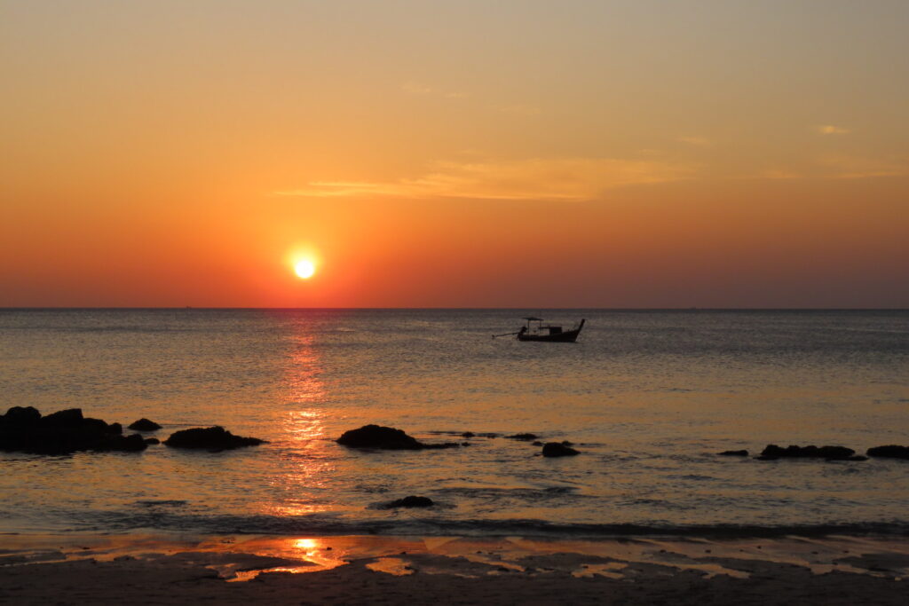 Heute geht es endlich weiter nach Koh Lanta. 11:30 startet unsere Fähre, die recht voll ist. Nach 1,5 Stunden legen wir am Pier auf Koh Lanta an. Der Hunger führt uns erstmal in ein Restaurant am Pier und dann fahren wir mit einem Taxi (leider gibt es nur diese Option) zu unserer Unterkunft. Dort dann die Enttäuschung: Unsere Bambushütte sieht baufällig aus, das Gemeinschaftsbad ist sehr weit weg und das einzige Waschbecken befindet sich am Müllplatz. Was wir zu diesem Zeitpunkt noch nicht wissen: Das Moskitonetz ist ein einziger Flickenteppich und die Kakerlaken sind riesig und viele. Wir gehen zum Strand und verbringen dort den restlichen Tag bis zum Sonnenuntergang mit lesen und baden.