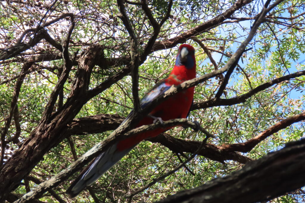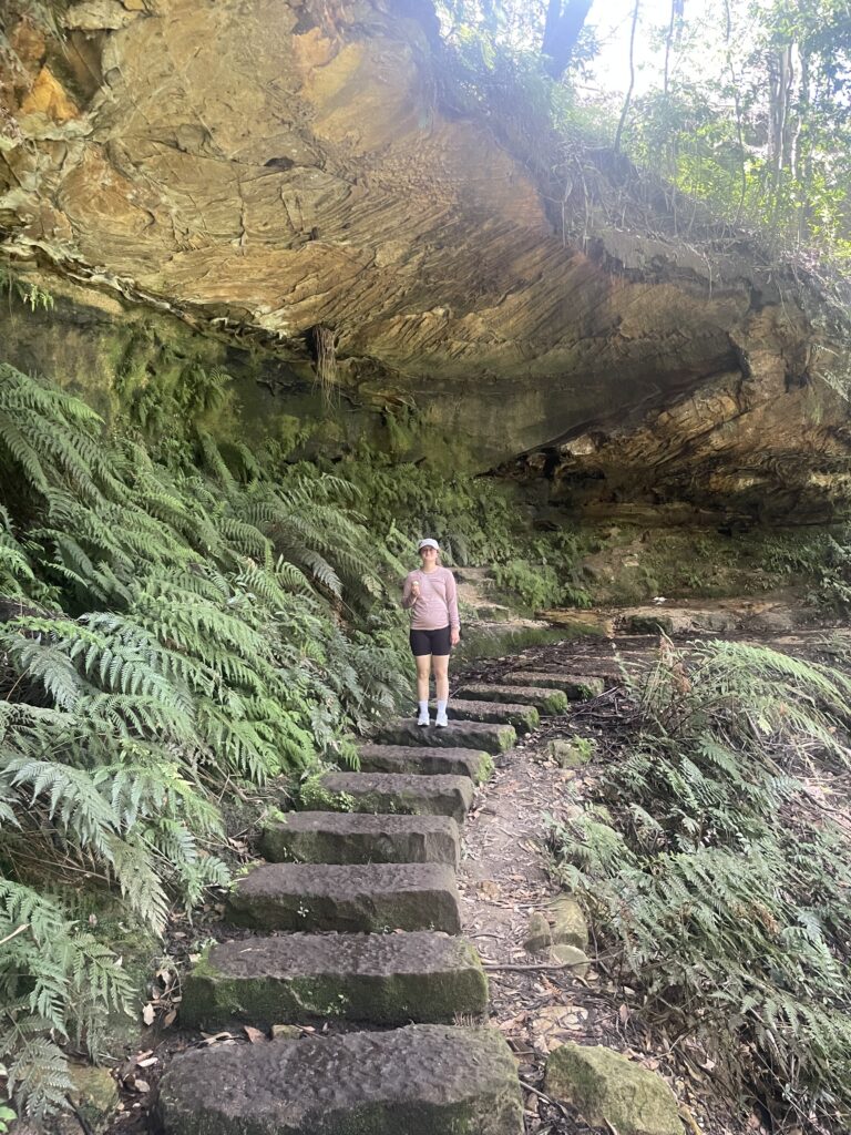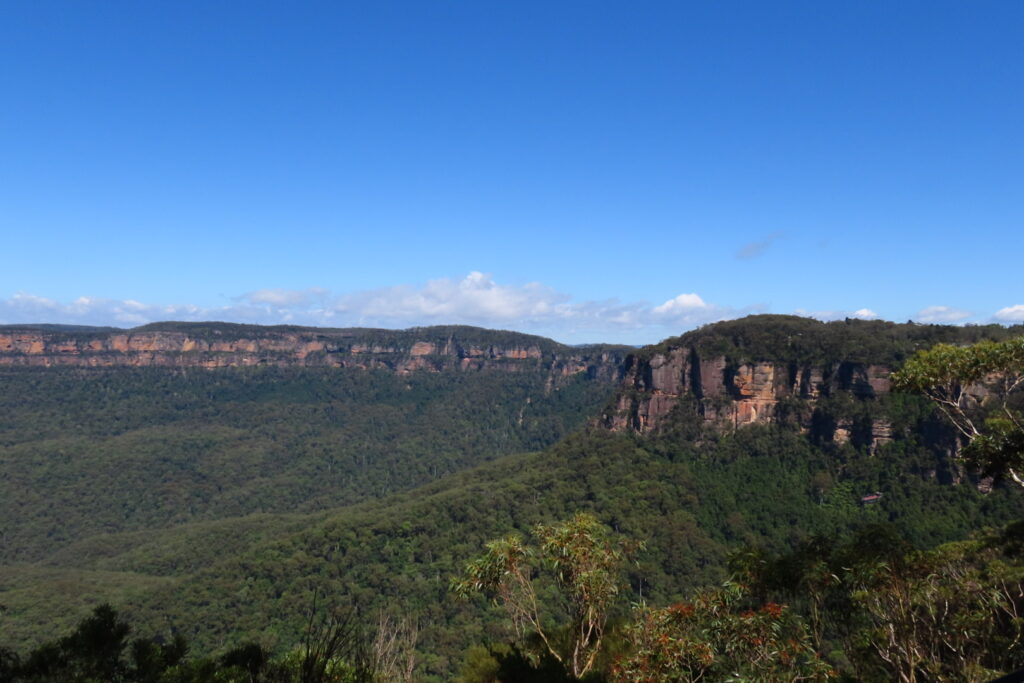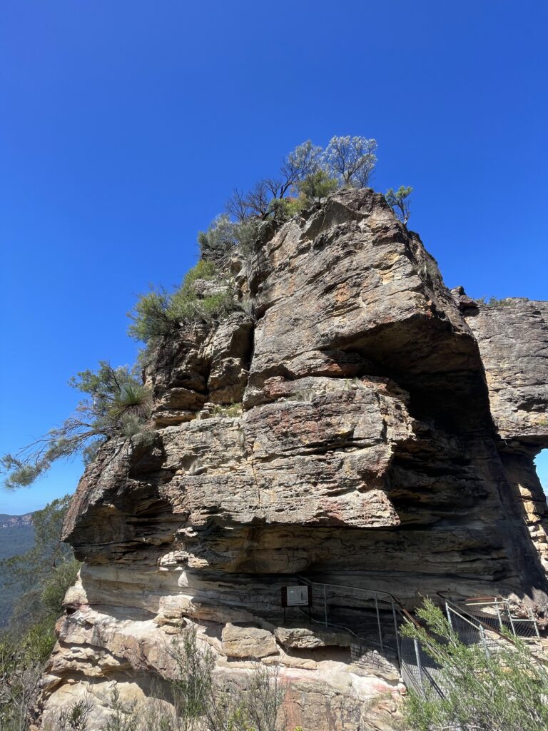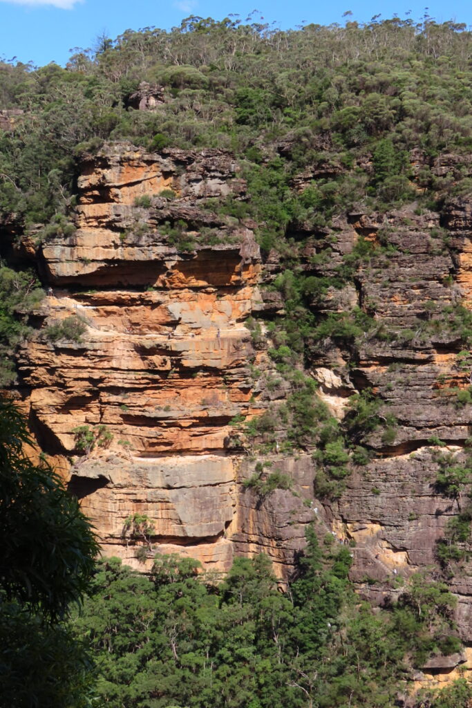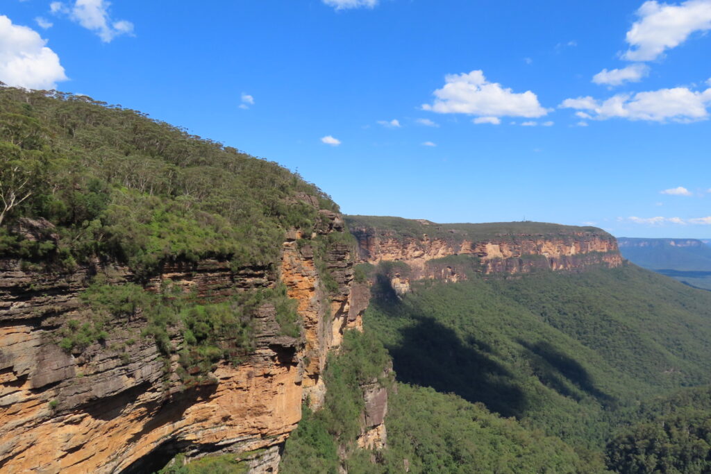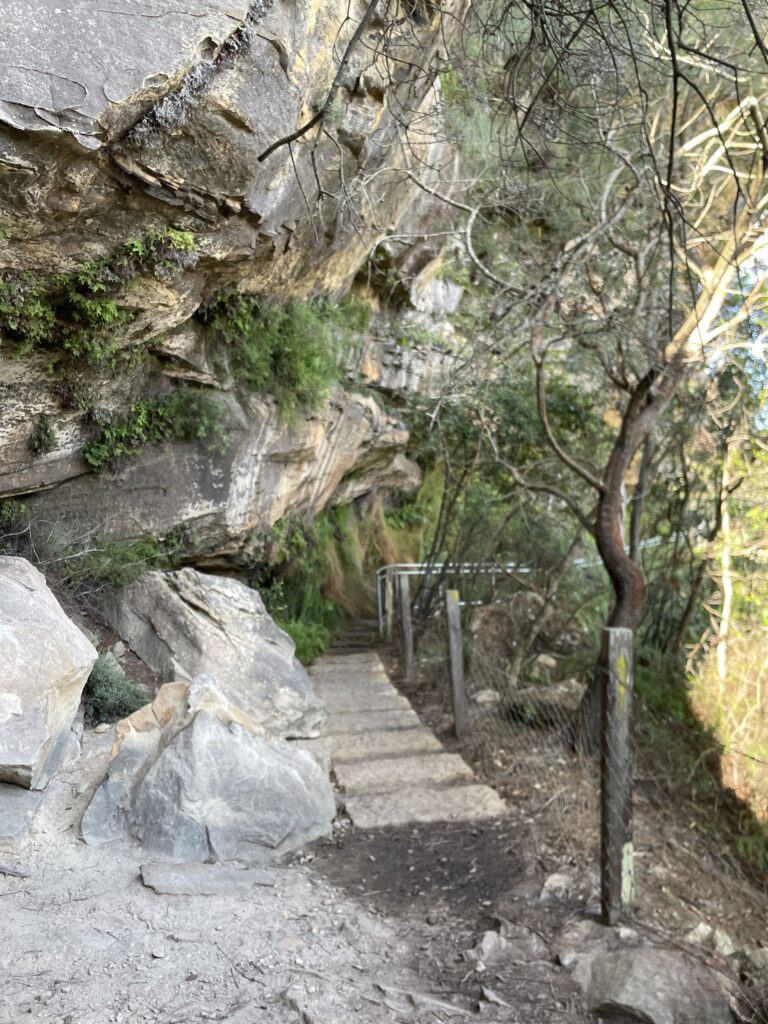 Wir laufen zuerst den Prince Henry Cliff Walk bis nach Leura. Einige Streckenabschnitte sind gesperrt, doch wir haben großes Glück, denn einer wird direkt vor uns wieder geöffnet. Auf dem Weg sehen wir einige umgestürzte Bäume, die wohl zuvor den schmalen Weg an der steilen Wand versperrt haben. Der Weg führt uns viele Treppen hoch und runter, wir machen viele Höhenmeter.