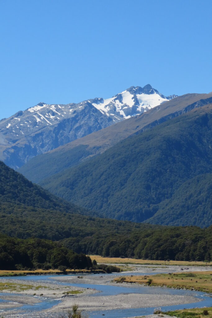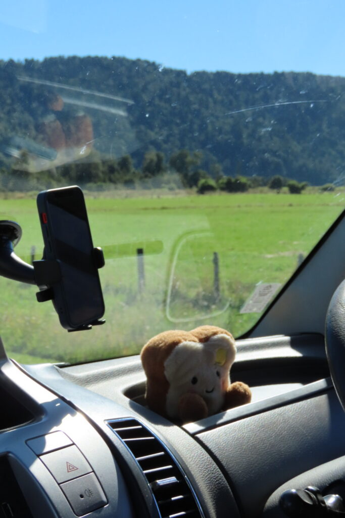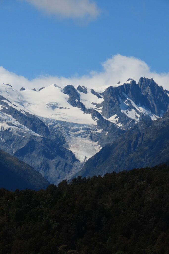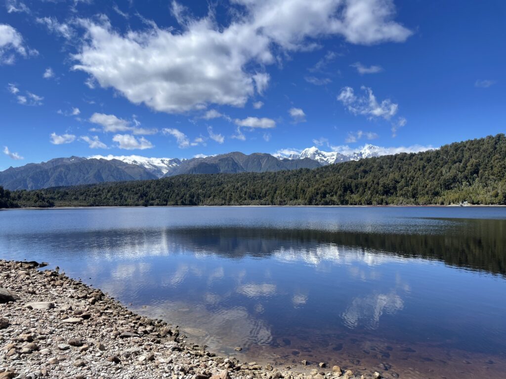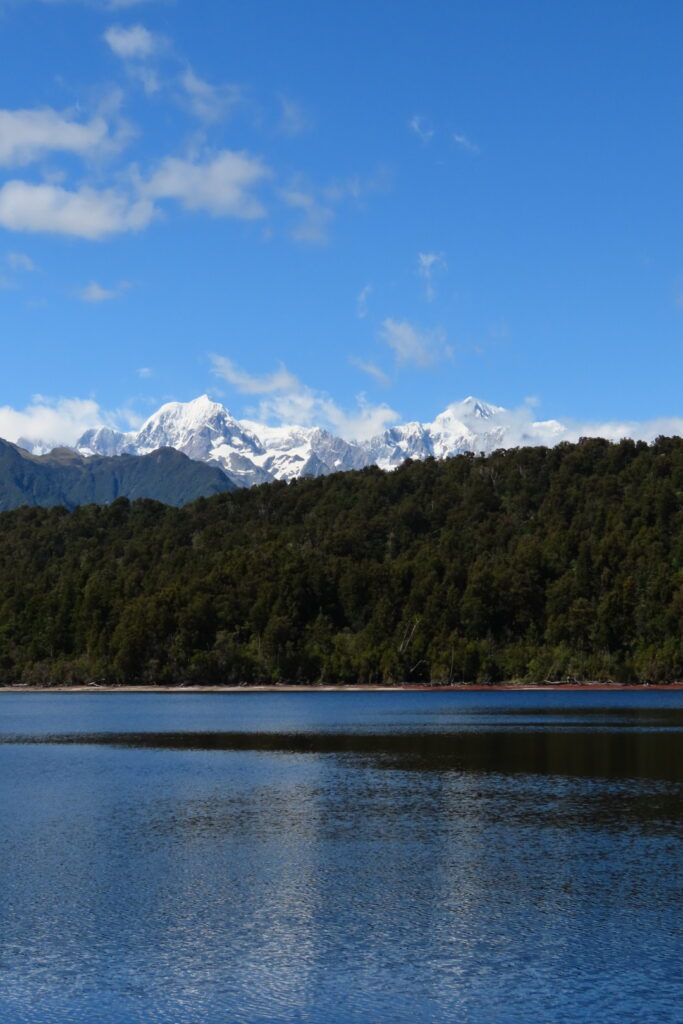Heute verlassen wir Franz Josef und fahren weiter nach Süden. Der Morgen ist ziemlich kalt, aber der blaue Himmel verspricht einen schönen Tag. Unseren 1. Stop machen wir am Lake Matheson. Dieser See ist bekannt für eine tolle Spiegelung der höchsten Berge und einen tollen Blick auf den Fox Gletscher. Zu Beginn des Wanderwegs ist es noch ziemlich voll, aber als wir uns dafür entscheiden zum etwas weiter entfernten Lake Gault zu laufen, verschwinden die Menschenmassen und wir sind plötzlich allein. Am Lake Gault angekommen, stellen wir fest das die Spieglung aufgrund von leichtem Wind und Wellen nicht perfekt ist. Dafür ist die Aussicht auf den Berg Tasman und den Berg Cook atemberaubend. Beide Gipfel sind gut sichtbar und auch den Fox Gletscher können wir bestaunen.