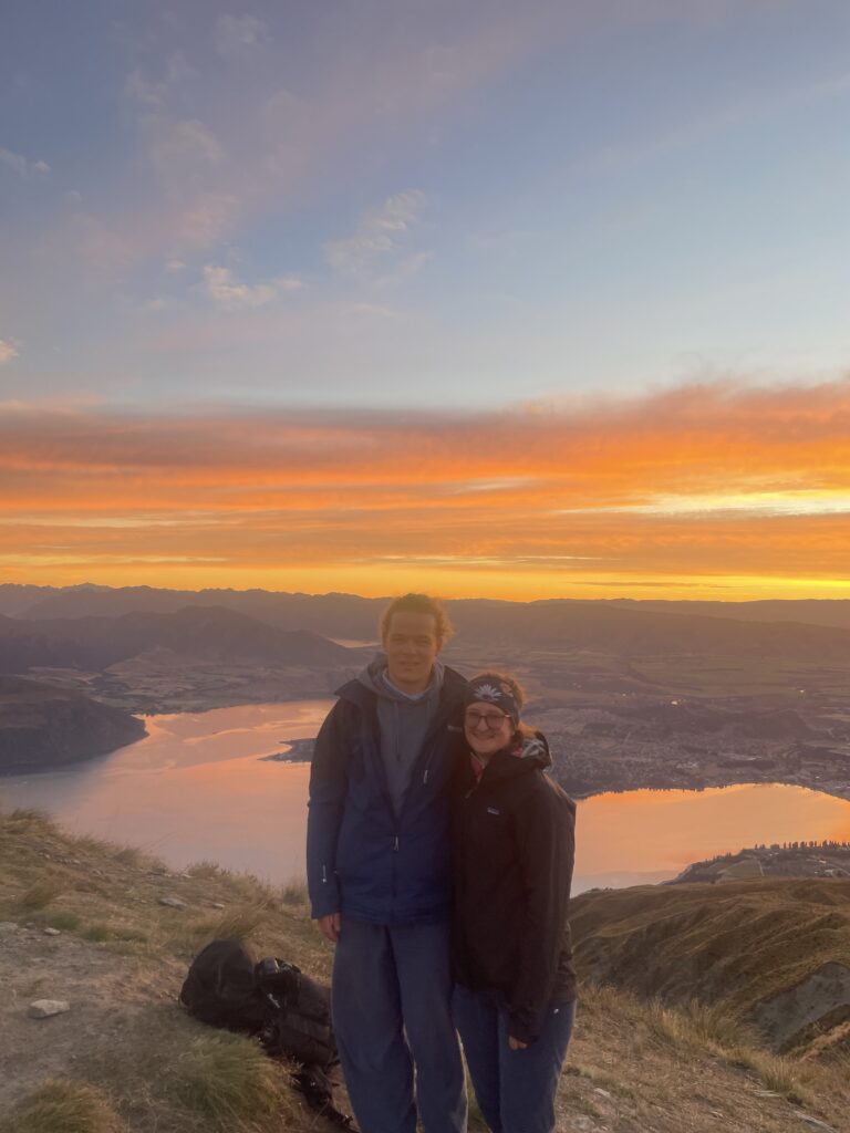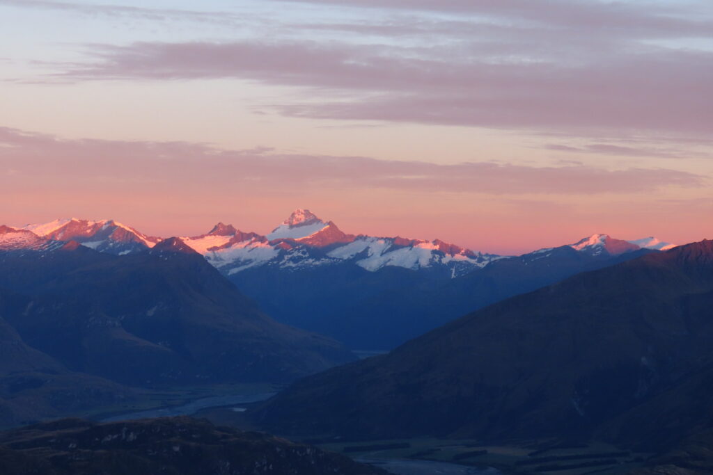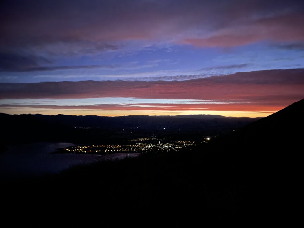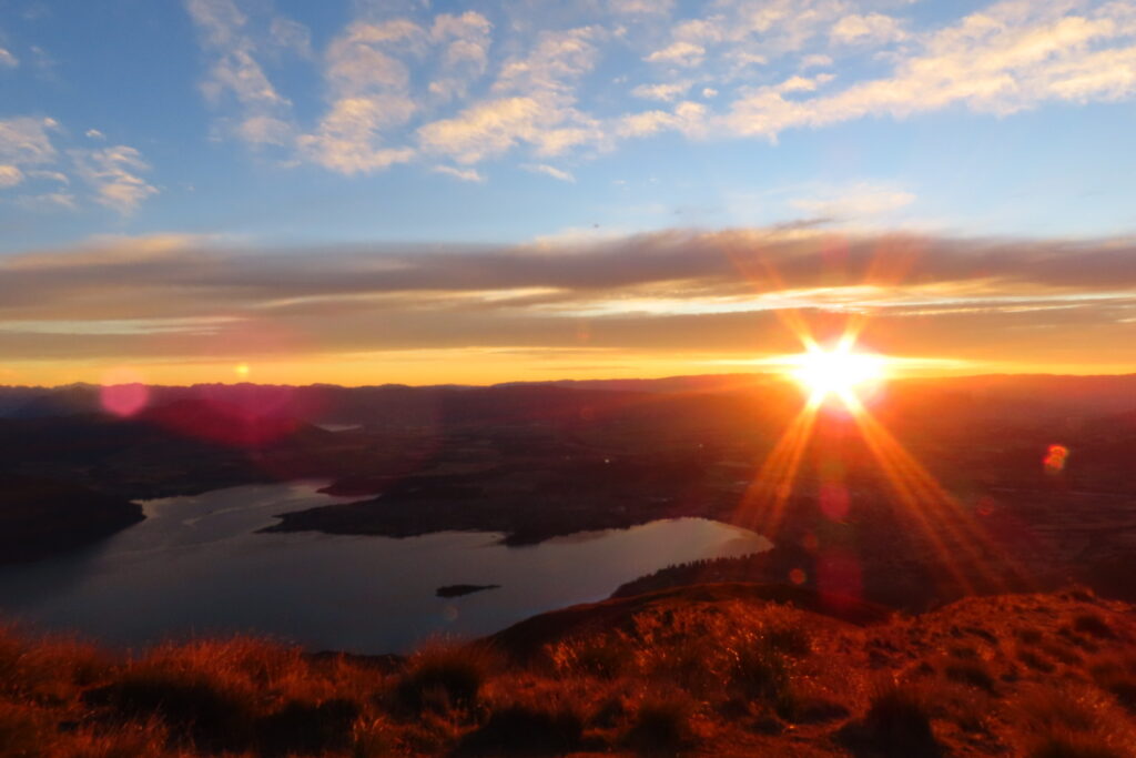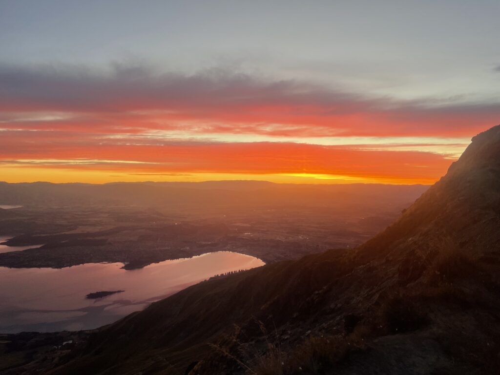 Unser Wecker klingelt 4:00 Uhr am Morgen. Wir wollen eine Wanderung zum Sonnenaufgang auf den Roy‘s Peak machen. Wir fahren zum Startpunkt der Wanderung und müssen feststellen, dass wir nicht die einzigen sind, die diese Idee hatten. Der Parkplatz ist fast voll und man kann einige Lichter den Berg hochlaufen sehen. Wir haben gute 2 Stunden Zeit auf den 1581m hohen Gipfel zu laufen. Der Weg geht steil den Berg hoch. Mit unserer Stirnlampe leuchten wir den Weg aus, als der helle Mond hinter dem Gipfel verschwindet. Langsam färbt sich der Himmel erst lila, dann rot und 4 Minuten bevor die Sonne aufgeht erreichen wir den Gipfel. Es ist kalt und es weht ein ziemlicher Wind. Wir ziehen viele Schichten an und genießen die unglaubliche Atmosphäre und den Sonnenaufgang.