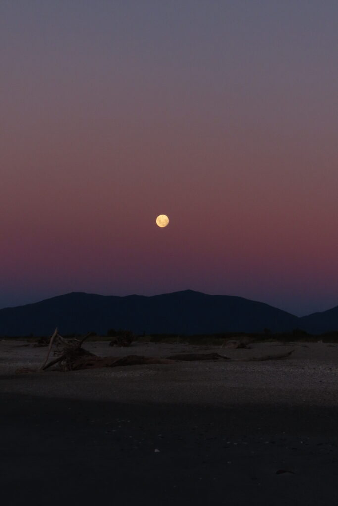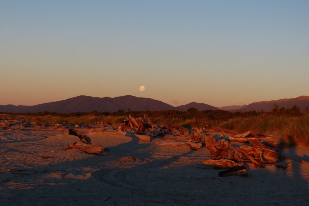 Unser Stellplatz heute befindet sich direkt hinter den Dünen. Zum Sonnenuntergang laufen wir nochmal vor zum Strand und schauen zu, wie die Sonne ins Meer taucht und der riesige Vollmond über die Berge kommt.