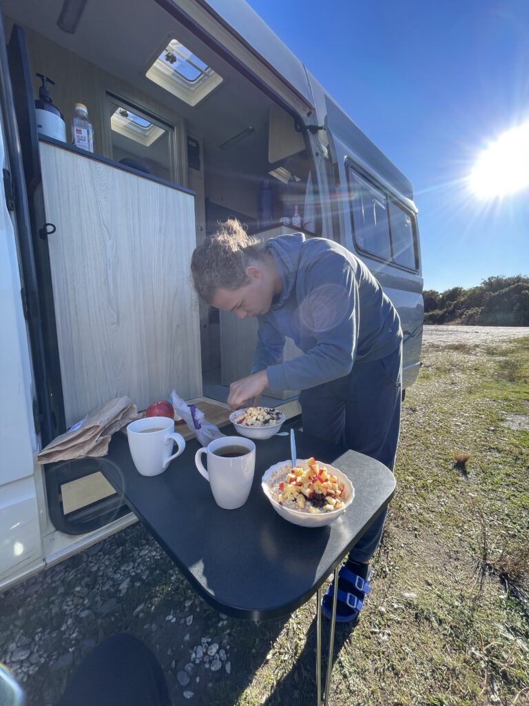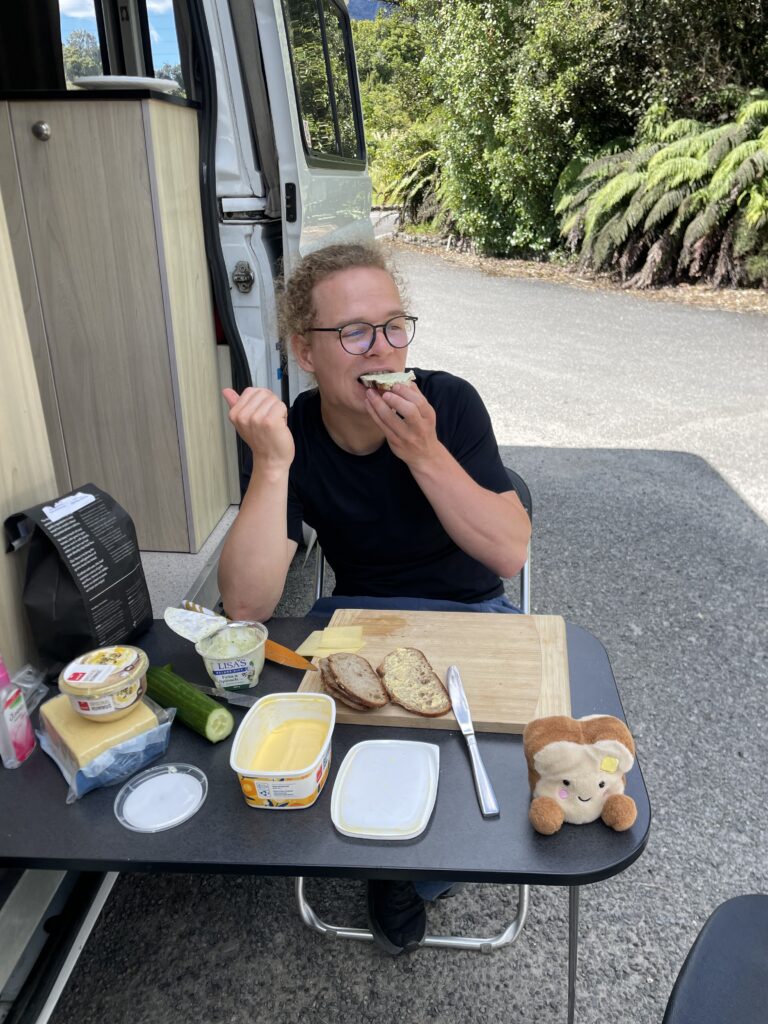 Heute fahren wir nach Osten, es geht nach Wanaka. Die Sonne scheint und wärmt uns, während wir draußen frühstücken.